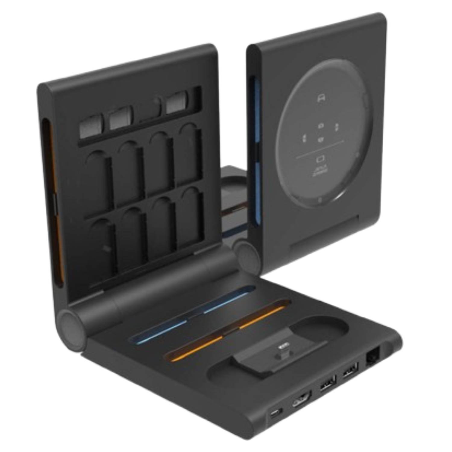 Эта док-станция для игр позволяет заряжать и хранить два комплекта контроллеров Joy-Con и один контроллер Switch Pro. Она также имеет слоты для SD-карт и может вместить до восьми игровых картриджей. Кроме того, она включает в себя быстрый порт Ethernet 1000 Мбит/с для плавной онлайн-игры без задержек, и она складывается для удобного хранения, когда вы ей не пользуетесь.
