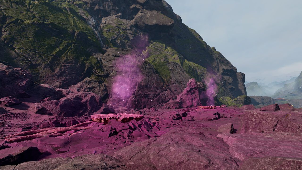 В StarRupture вы можете найти залежи гелия к северу и востоку от места вашего старта. До них немного пройтись, но их легко опознать – они выглядят точно так же, как меньшие, ярко-фиолетовые камни, с которыми вы уже сталкивались, и даже производят тот же дым.