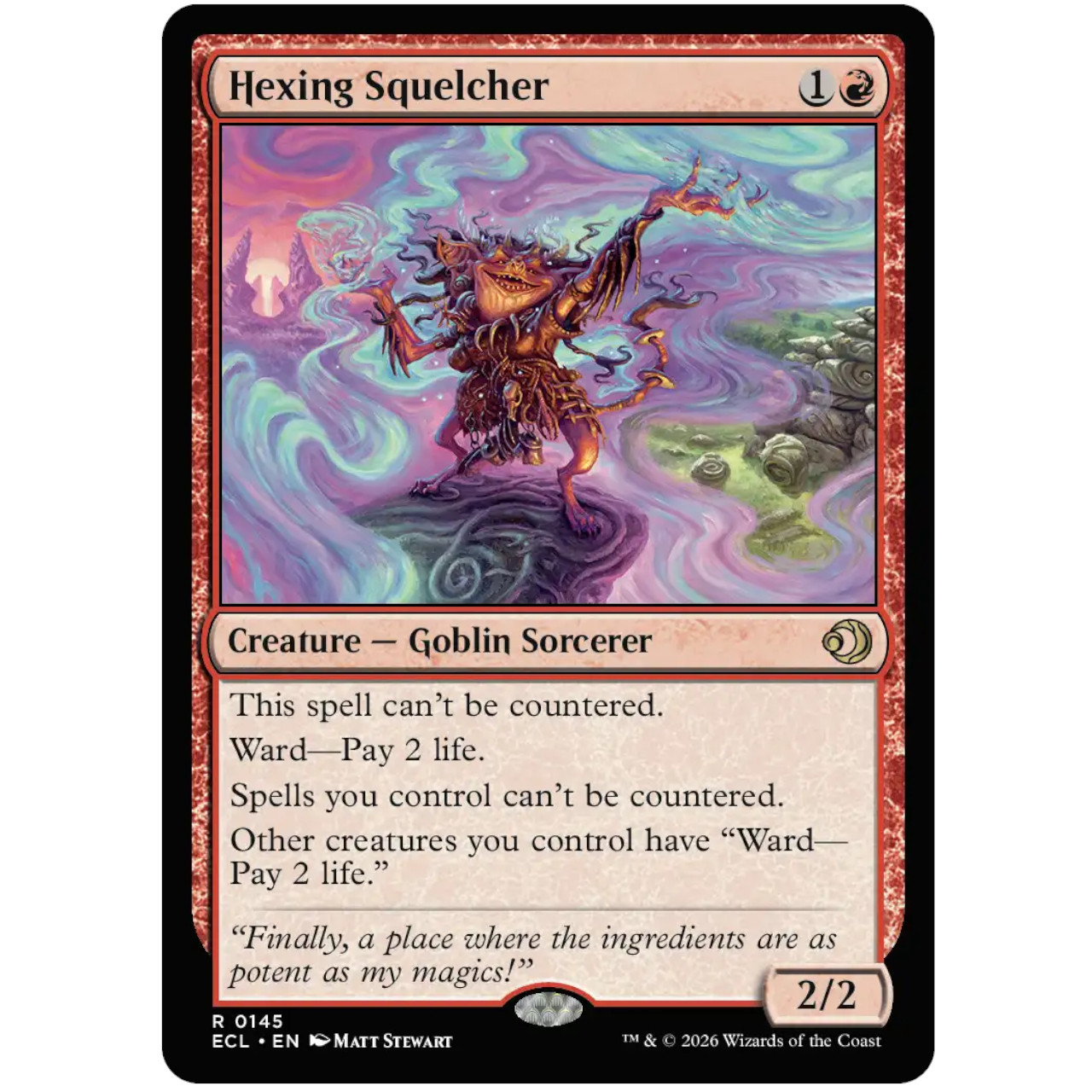 Hexing Squelcher из набора Lorwyn Eclipsed – действительно сильная карта. Всего за одну обычную ману и красную ману вы получаете Гоблина 2/2 – достойное дополнение к большинству колод Гоблинов. Но именно его способность выделяет его, и, вероятно, против этой карты будет очень сложно играть в текущем формате Standard.