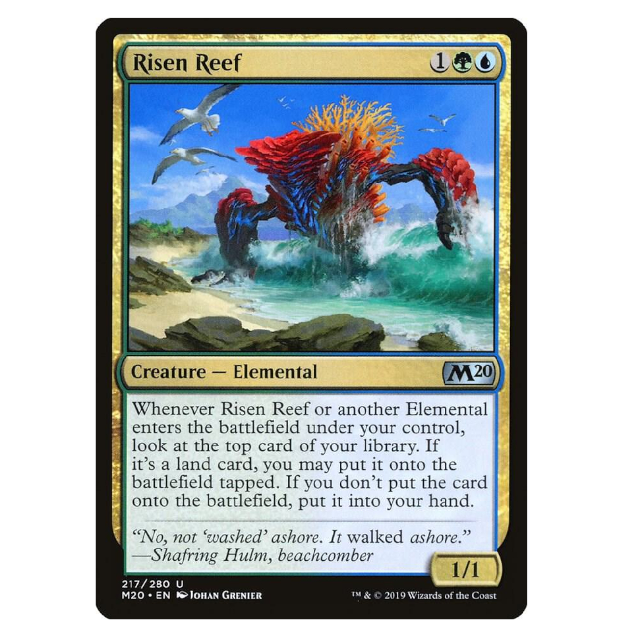 Окей, я проверил Risen Reef, и это действительно круто. В основном, каждый раз, когда на поле боя выходит элементальное существо – и поверьте мне, эта колода полна ими – это дает мне шанс получить дополнительную ману или вытянуть больше карт. Это действительно эффективный способ нарастить свои ресурсы и держать руку полной. Вы можете найти это на TCGPlayer, если вам интересно!