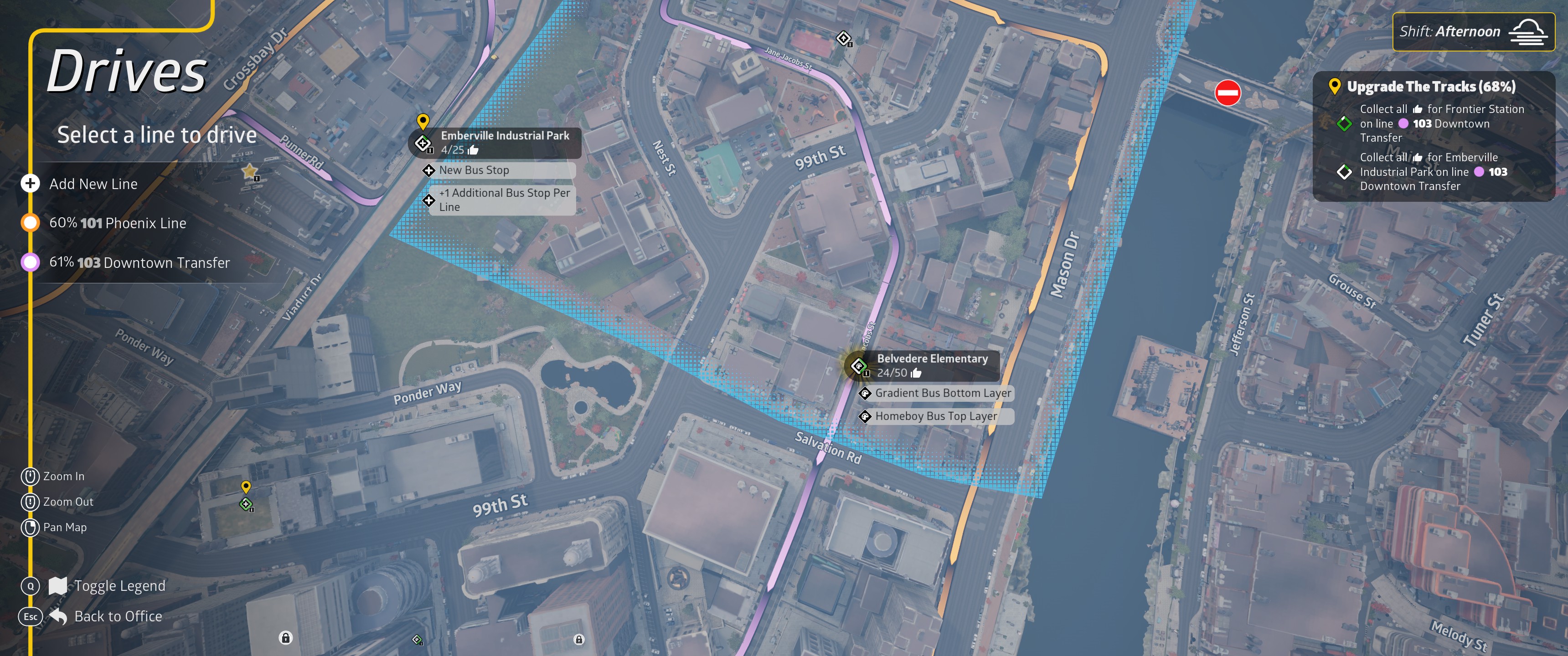 С помощью карты вы можете выбирать автобусные маршруты, которые хотите использовать, или разрабатывать совершенно новые. По мере добавления новых автобусных остановок в ваш город вы можете обновлять существующие маршруты, чтобы включить их – в противном случае пассажиры не смогут использовать эти остановки, и вы не будете получать награды. Вы также можете добавлять промежуточные точки вдоль маршрута, чтобы точно настроить, куда поедет автобус между остановками.